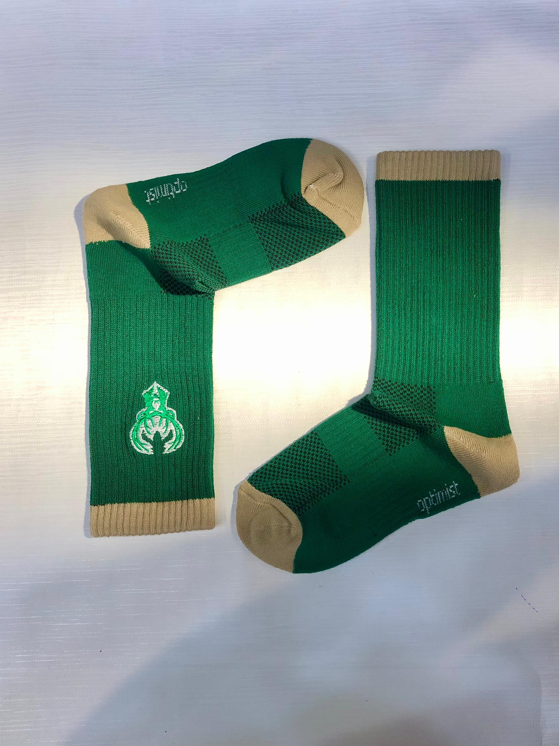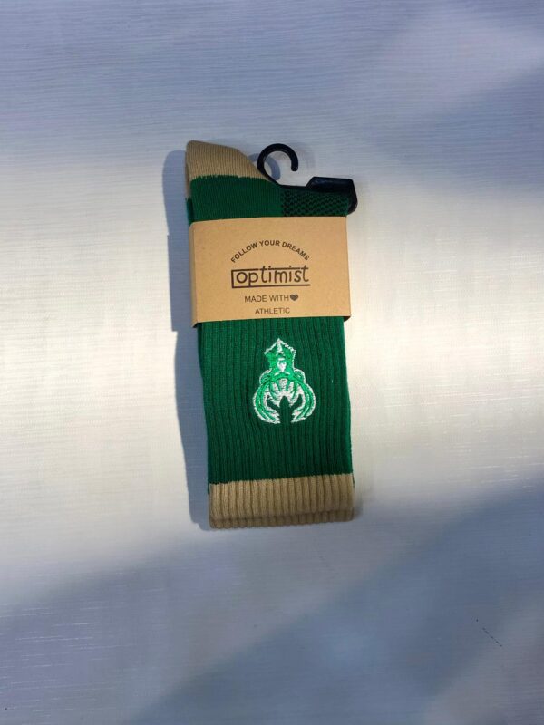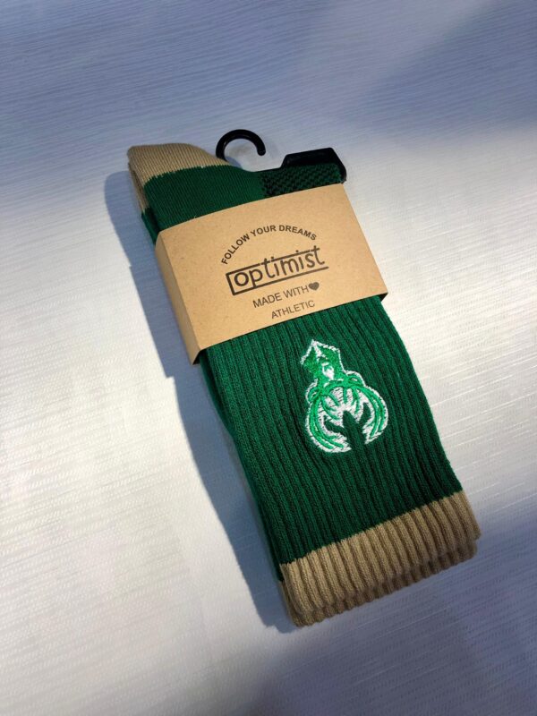 جوراب ساقدار کش انگلیسی اتلتیک برند Optimist طرح تیم بسکتبال Milwaukee Bucks (میلواکی باکس) رنگ سبز و کرم