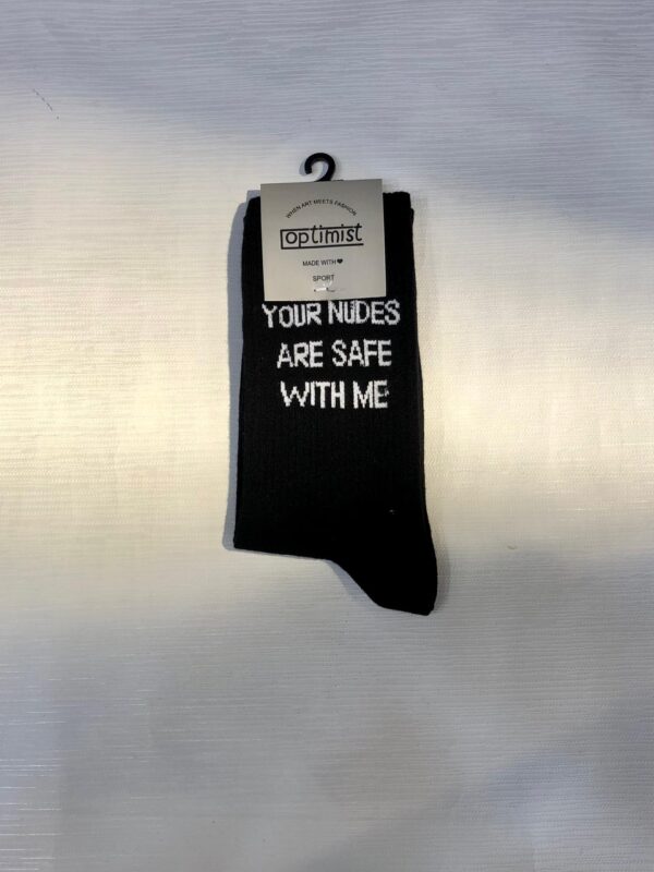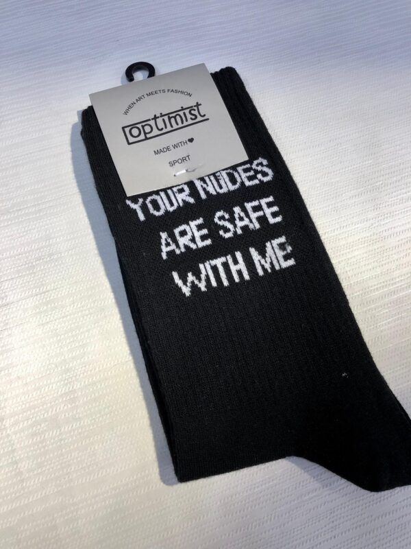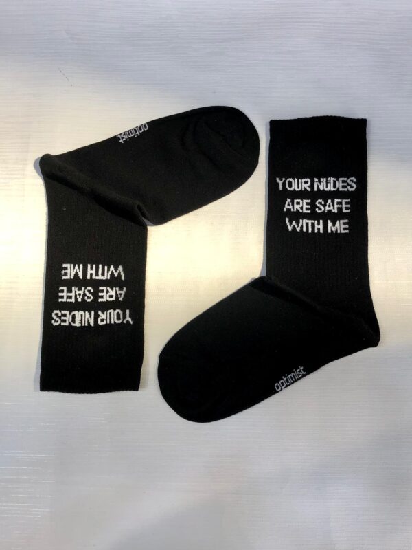 جوراب ساقدار کش انگلیسی اسپرت برند Optimist طرح تکست (texture Socks) نوشته (Your Nudes Are Safe With Me) به معنی: برهنه هایت با من در امان است.
