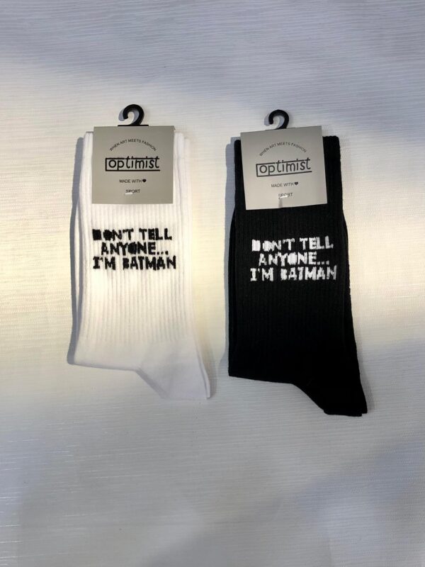 جوراب ساقدار کش انگلیسی اسپرت برند Optimist طرح تکست (texture Socks) نوشته ( Don’t Tell Anyone…. Im Batman) به معنی: به کسی نگو ، من fتمنم